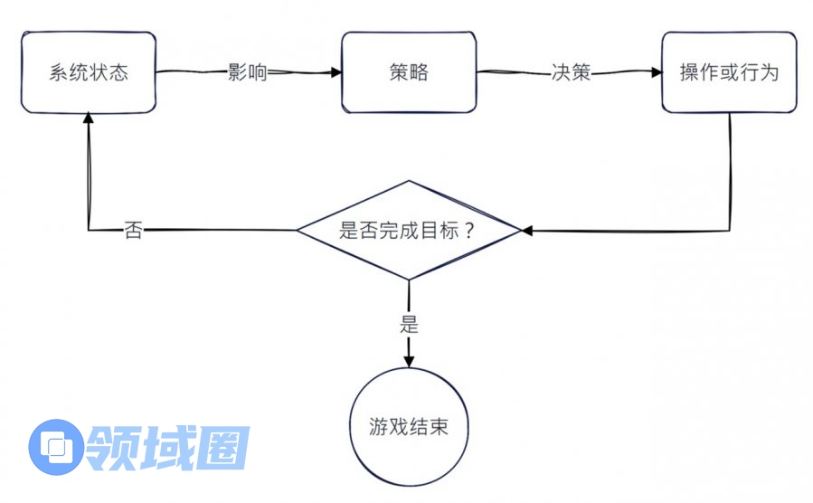 经过对目标、状态、决策和博弈系统的解释,整个策略类游戏的循环架构图呼之欲出了,因为既然行为能改变状态、状态能够影响下一轮决策,就形成了一个循环结构。