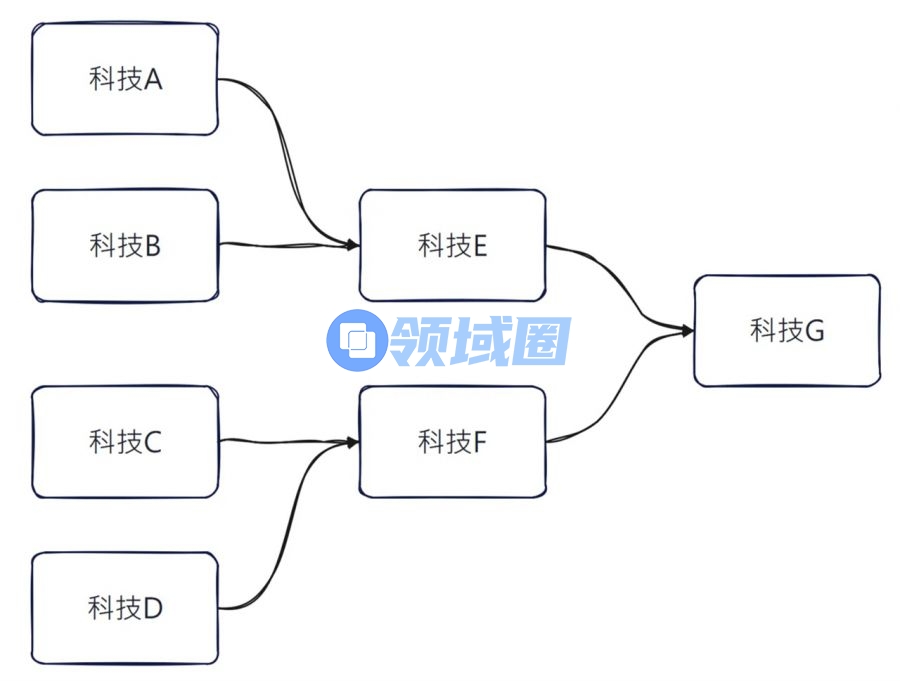 在写游戏中的经济学浅析一文的时候,曾经提到过价值链的流动模式,通常来说价值链依据其趋势可以分为朴素式流动、融合式流动和扩散式流动。但除了价值链之外,任何带有节点性质的概念都是一样的,比如科技树。所谓融合式科技树大概是这种感觉: