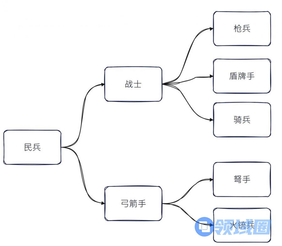 扩散式流动则强调结果的未知,强调发展,强调玩家应该根据环境和局势的变化来选择不同的科技以更好地处理目前的对局。比如下列科技树,最初的玩家招募的都是民兵,但是它可以通过科技树来升级为不同的兵种以适应不同的战场环境。