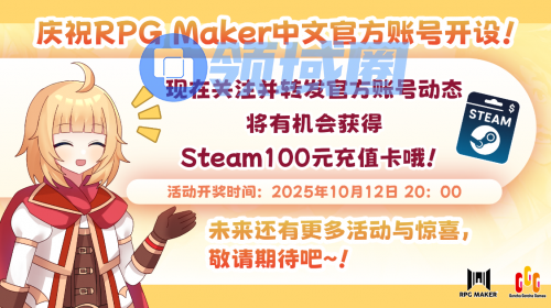 为庆祝官方账号的启用,RPG Maker官方将在B站与微博同步开启抽奖活动。即日起至2025年10月12日,关注官方账号并转发入驻动态,即可参与抽取100元Steam充值卡。未来还将会有更多惊喜活动!