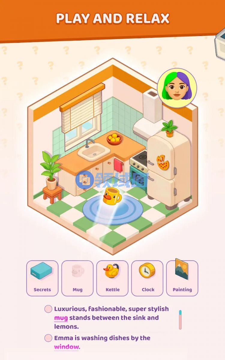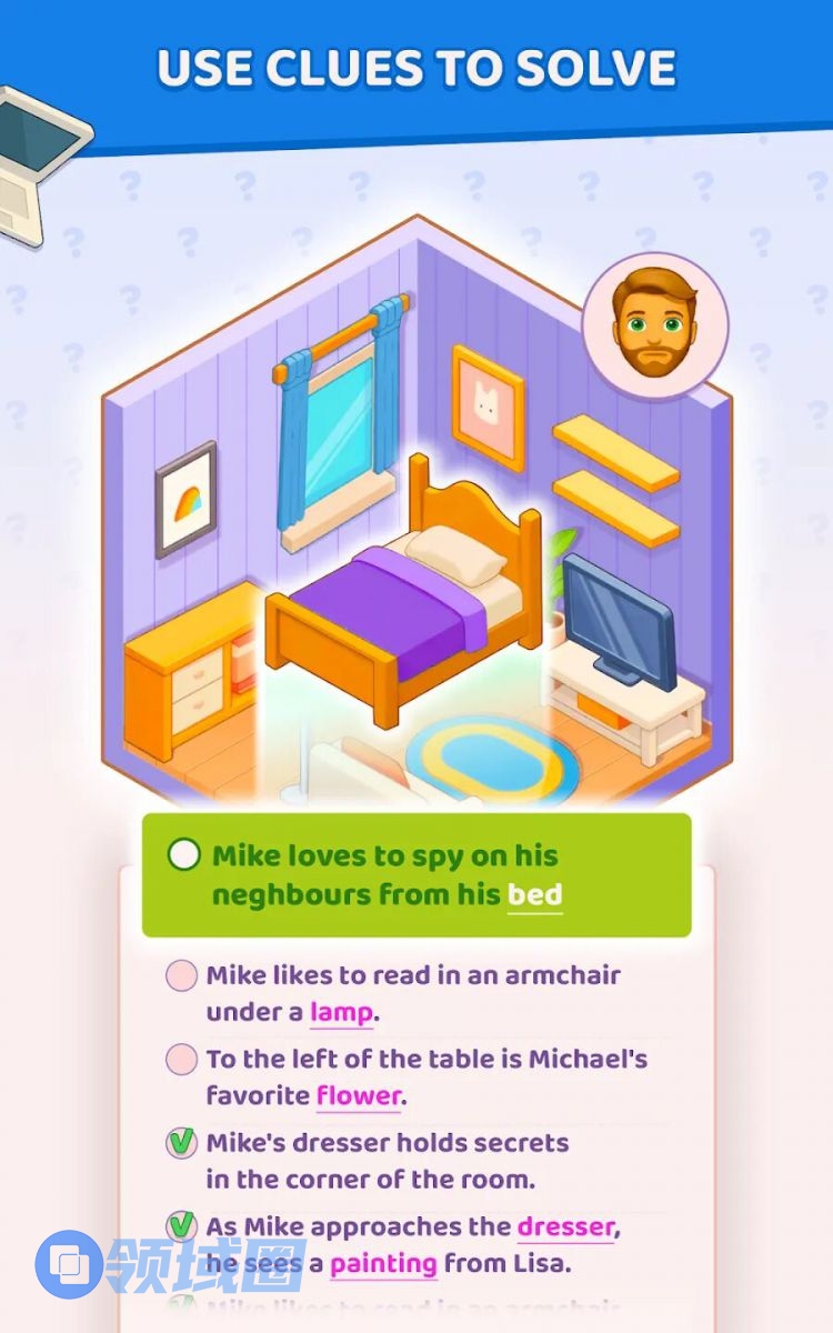 介绍:Room decor玩法之前看到的更偏向于拼图puzzle,把各种物件按照剪影放在房间中设定好的位置。这款放弃了剪影提示和拼图puzzle,改用logic的规则玩法进行包装,用一段段文字,提示各种物品应该摆在什么位置,或者与其他物品摆放应该是什么相对关系,玩起来变成了一种图形化logic玩法了。
