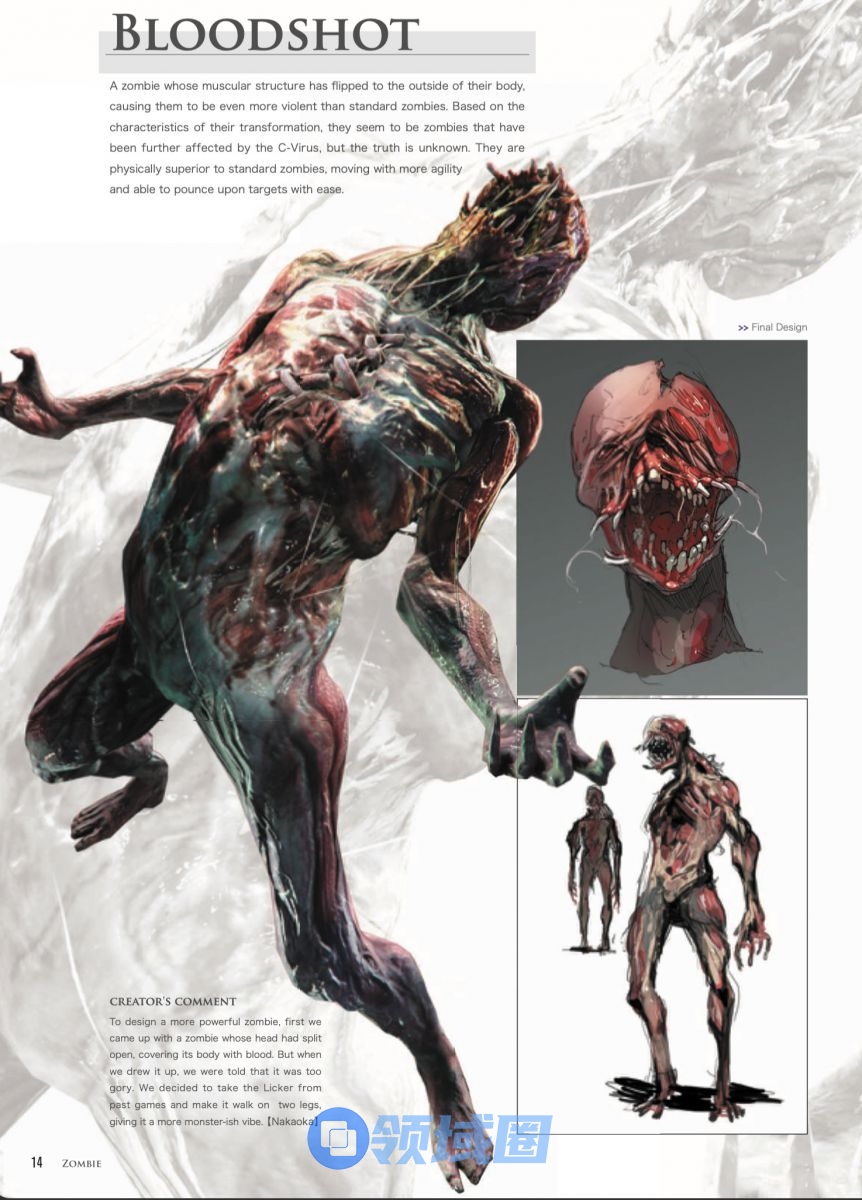 就拿最经典的丧尸来说吧。在《生化6》里,丧尸也不再是你印象中那个打倒就完事儿的经验包了。其中一种精英怪叫“血眼”(Bloodshot)。设定集里描述它为「肌肉结构翻转到体外的丧尸」。简单说,这就是一个丧尸的二次变异形态。当一个普通丧尸受到足够伤害后,它体内的C病毒可能会被激活,然后在一阵抽搐后,整个身体的肌肉组织由内而外地翻出来,变成一个浑身赤红、暴露着筋腱、攻击性和敏捷度都大幅提升的怪物。