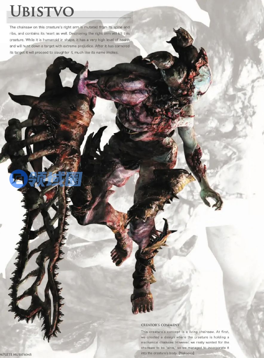 它的核心设计理念,用设计师中冈的话说,就是一把「活着的电锯」。起初,开发团队的设计方案只是一个怪物拿着一把机械电锯,但他们觉得这样不够有创意,不够癫,于是他们决定让电锯本身就是活的,让它成为怪物身体的一部分。