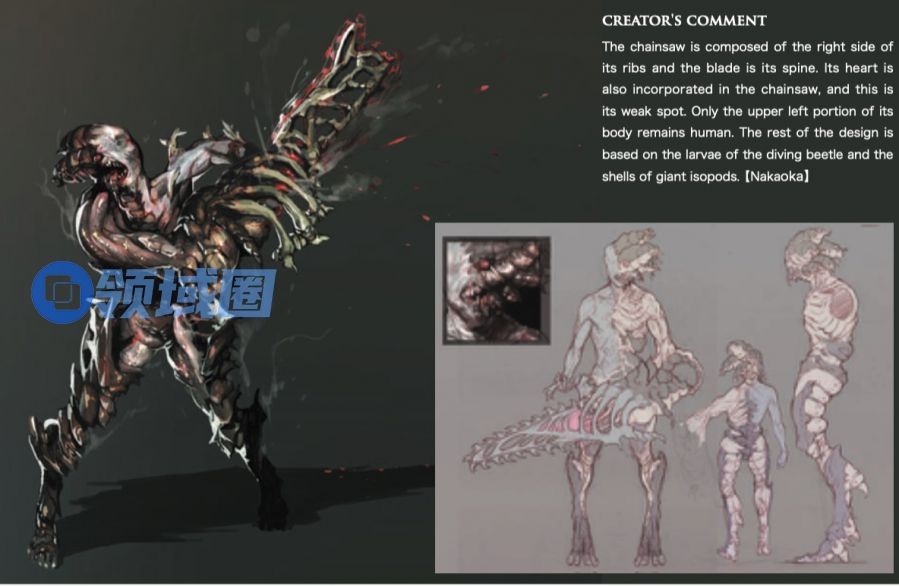除了「活体电锯」这个核心概念,设计师还融入了其他生物的特征来完善它的形象,比如它身体上除了左上半身还保留着部分人形,其余大部分的设计灵感来源于潜水甲虫的幼虫,大王具足虫的甲壳,这让它的身体呈现出一种坚硬、节肢化的外骨骼质感。