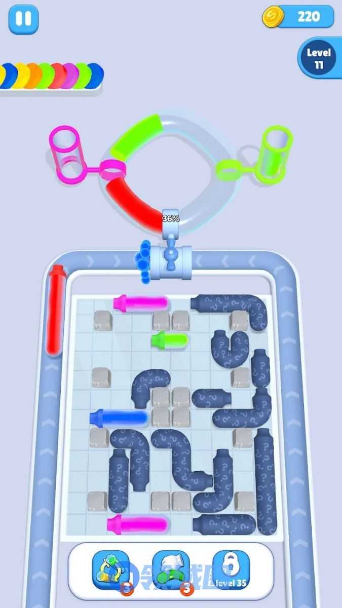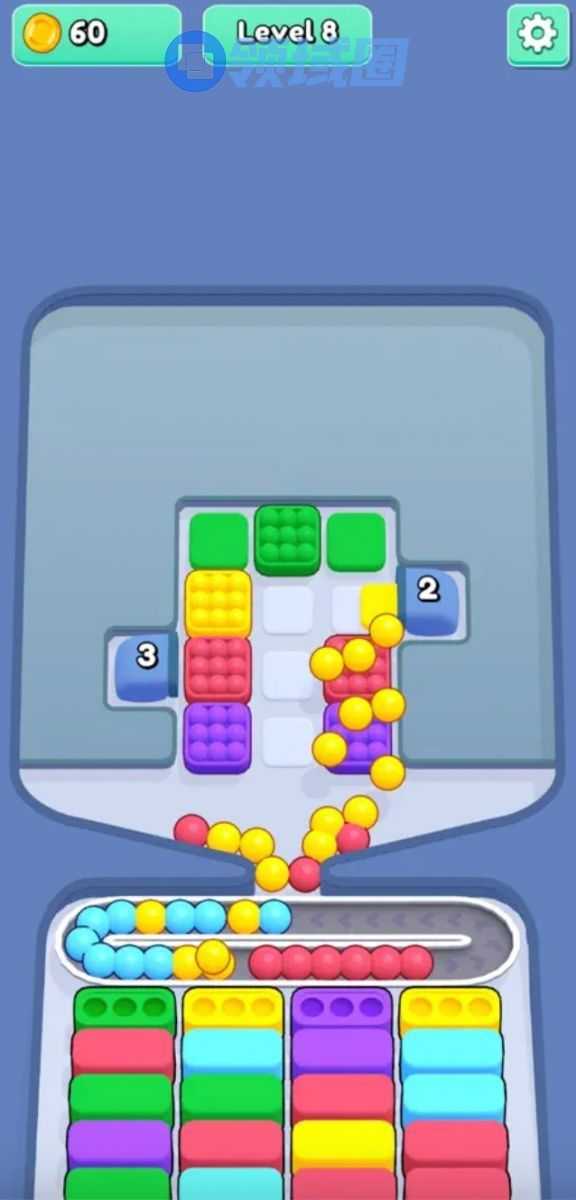 介绍:玩法并不算特别新鲜,还是几种玩法&表现的组合。下方是彩色小球sort,对应颜色的小球被对应颜色的盒子收集。而上方释放小球的玩法是点击各个颜色的小盒,然后盒子爆开,小球落入下方的传送带中。玩起来的策略选择是看下方的彩色小盒布局,控制点击释放对应颜色。