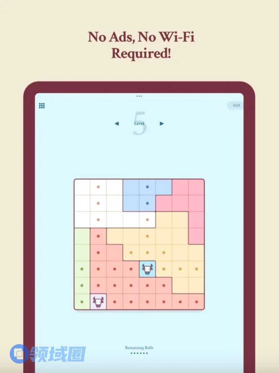 介绍:数独一个基础玩法的变种,在每个不同颜色的面积中,只能放置1头牛;每行、每列、相邻8个格子只能放置1头牛。用这两个规则+每关地图与颜色的设置,来放牛解决每一个关卡。