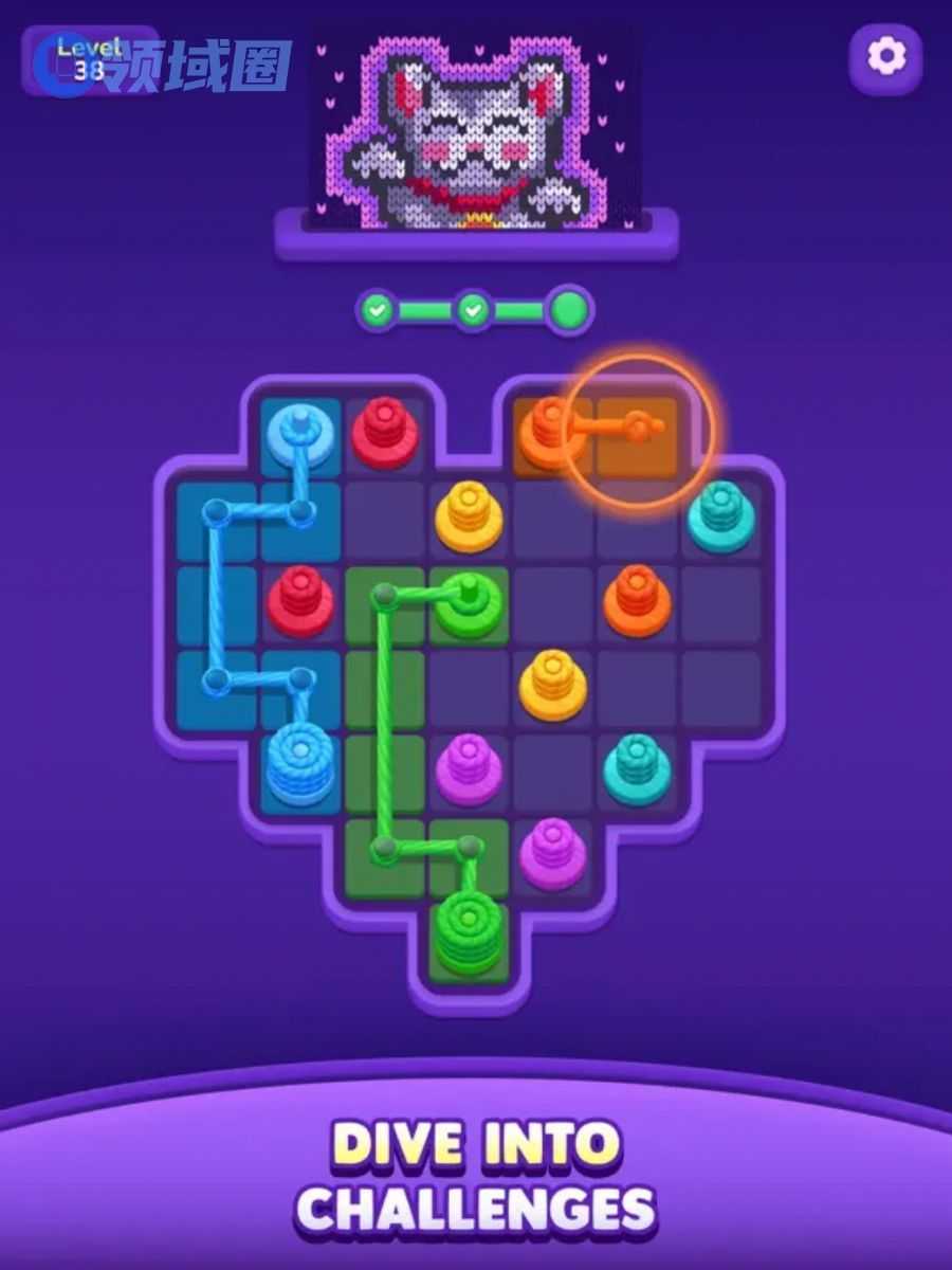介绍:Tripledot出品,玩法是多个颜色的纺锤,在地图中将同色连线,彼此连线之间不能交叉的路线规划玩法,像素画增加目标感,纺锤题材增加一些解压感受和买量优势。近期Tripledot的美术化改编益智玩法的进程加快了不少,最近几周已经连续有多款这种方法论的新品上线了,值得关注。