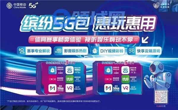 办理5G缤纷包,和林更新一起竞无止境。5G缤纷PLUS包含2TB移动云盘、50GB咪咕定向流量,方便你保存比赛的每一个精彩瞬间。还有云VR会员、视频彩铃、咪咕钻石会员、咪咕快游30小时会员等福利等你来拿。