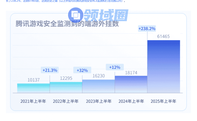 2025年上半年,随着游戏款数和游戏玩家量的增加,游戏黑产愈发活跃,腾讯游戏安全监测到的PC端游戏外挂数同比2024年上半年,呈现剧增态势,同比增长了238.2%,达到61465款,达到历史之最(以上外挂均在腾讯游戏安全ACE监测和打击范围以内)。