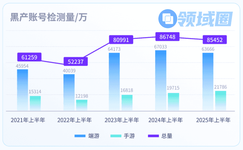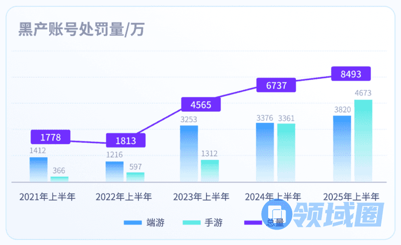 2025年上半年,腾讯游戏安全处罚的黑产账号量约为8493万个,同比2024年上半年(6737万个)上升20.6%;其中端游黑产账号处罚量同比上升13%,上升量为444万;手游黑产账号处罚量同比上升39%,上升量为1312万;