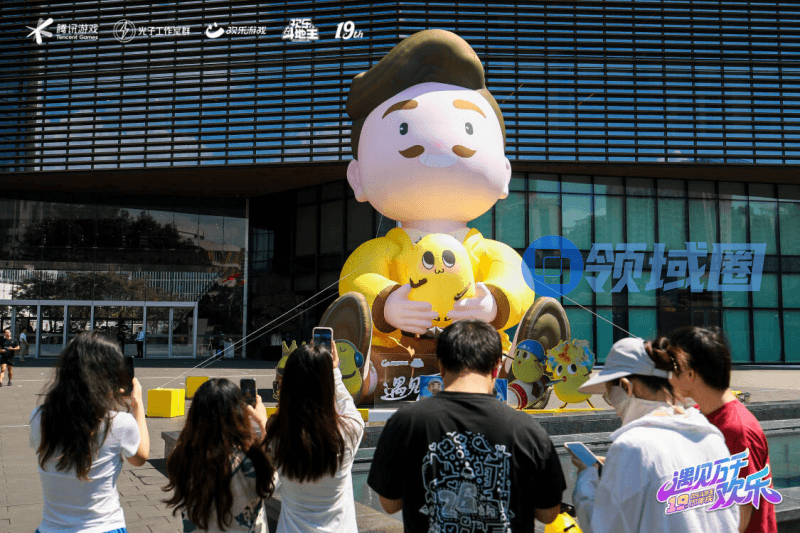 更亮眼的是,官方直接在腾讯滨海大厦来了波“高调”官宣,大厦前立起巨型的“地主抱欢乐豆”气模,夜晚更是有“欢乐斗地主,遇见万千欢乐”以及各种经典“游戏黑话”灯光秀,仪式感直接拉满。无数玩家也前来打卡拍照,这排面简直绝了!
