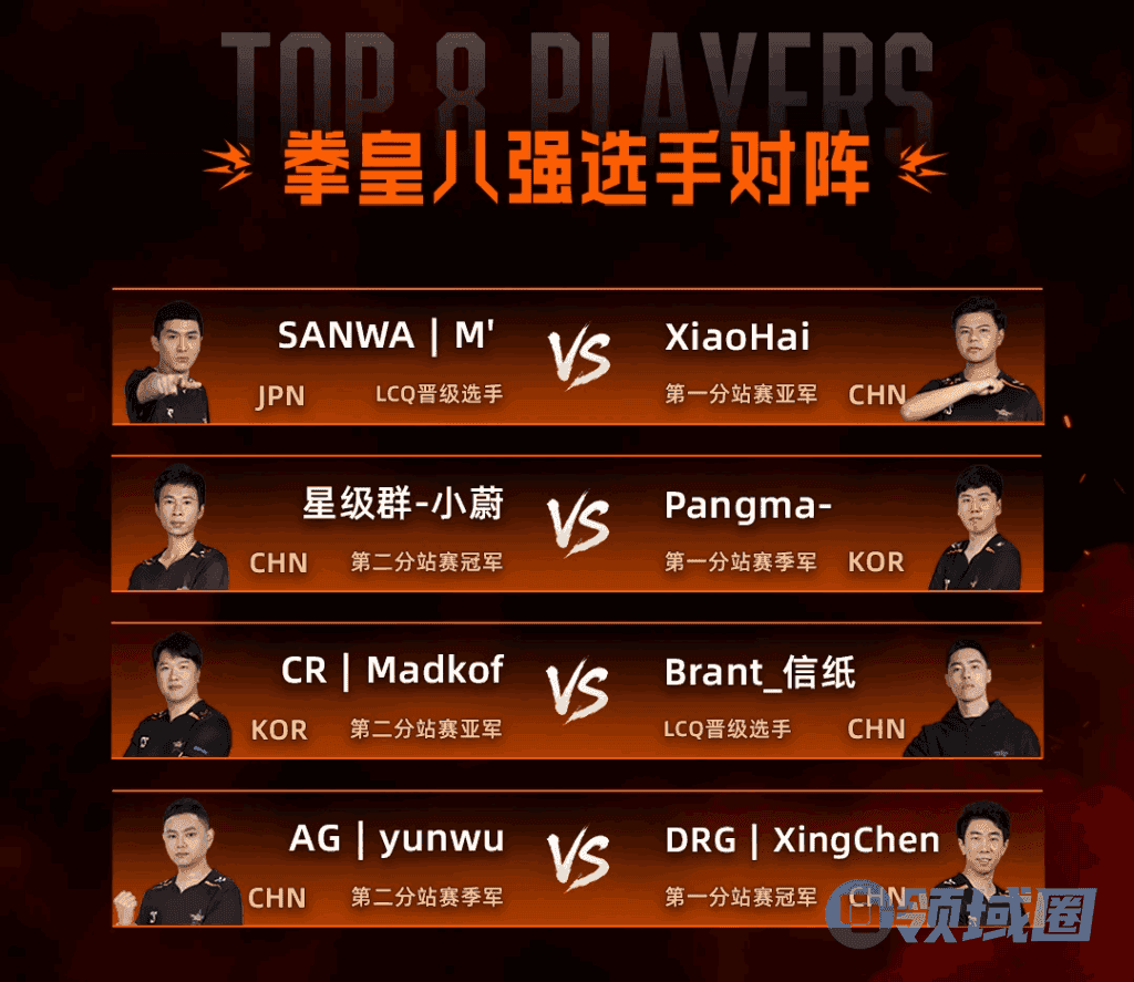 《拳皇15》项目:XingChen、XiaoHai、Pangma、小蔚、Madkof、yunwu、信纸、M’。首轮对阵如下: