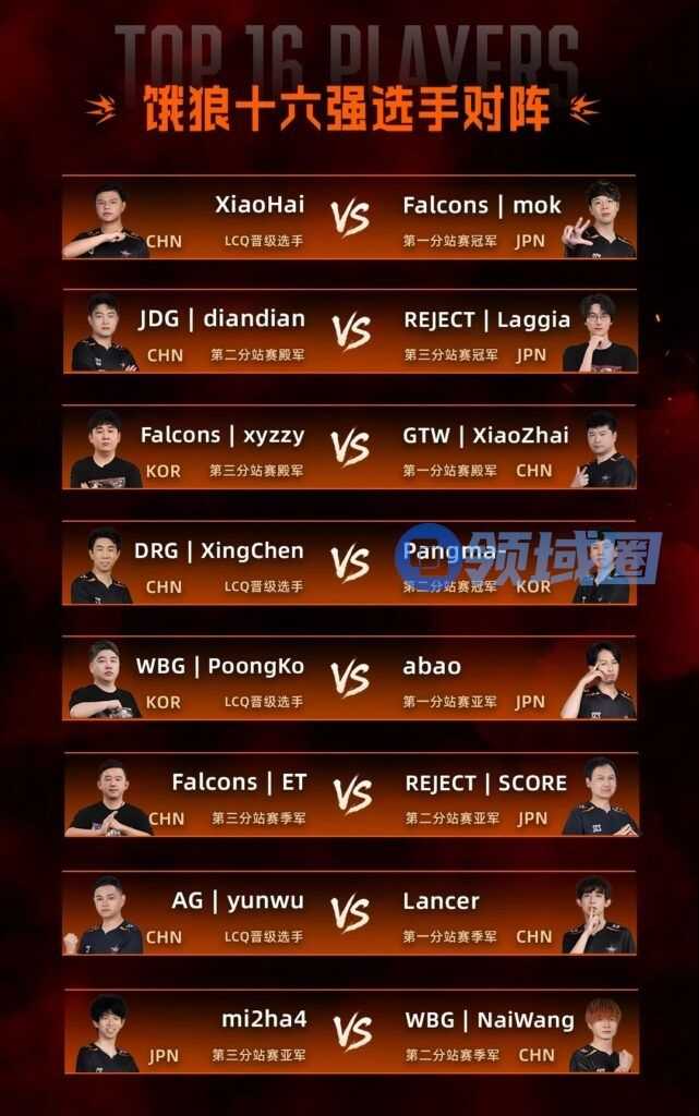 《饿狼传说:群狼之城》项目:mok、abao、Lancer、XiaoZhai、Pangma、Score、NaiWang、diandian、Laggia、mi2ha4、ET、xyzzy、XiaoHai、yunwu、PoongKo、XingChen。首轮对阵如下: