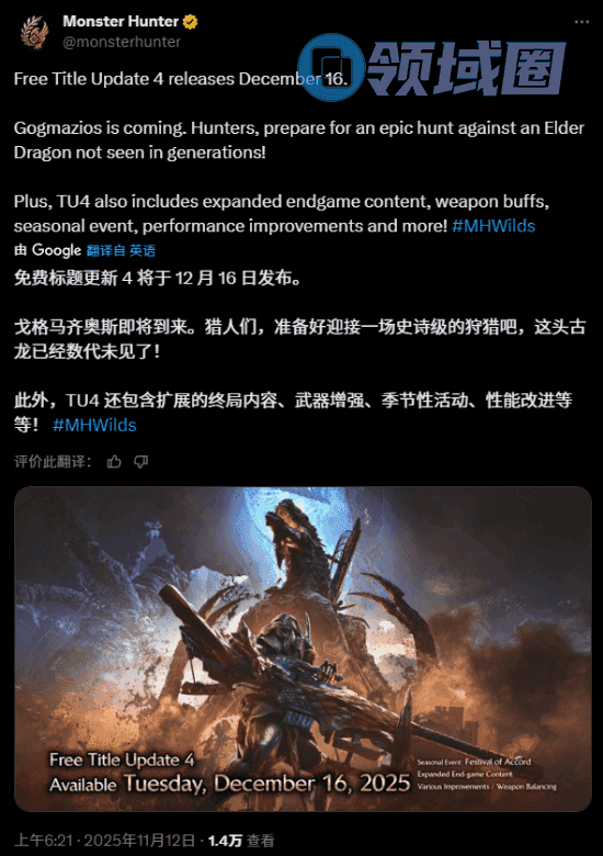 在今天索尼的State of Play发布会上,《怪物猎人荒野》公开新预告,游戏第四次更新确认将于12月16日上线,新增巨戟龙。