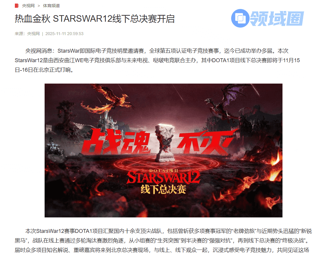 11月15日至16日,全球第五项认证电子竞技赛事——十二届StarsWar国际电子竞技明星邀请赛DotA1项目线下总决赛,将在北京微博IN·钻石中心正式举办,央视网11日发文称赞并推荐了该赛事。本届赛事由KK官方对战平台赞助,共同助力经典游戏复兴!