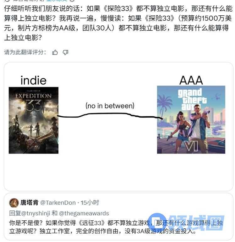 目前该争议并未获得统一的结果,估计接下来一段时间也不会出结果。你又如何看待《33号远征队》获得“最佳独立游戏”类提名?又觉得它到底是不是独立游戏呢?