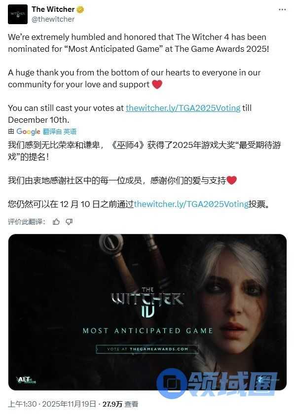 CD Projekt Red对《巫师4》获得TGA提名作出回应,这家波兰工作室表示“深感惶恐与荣幸”。这款备受期待的作品与《GTA6》、《007:初露锋芒》、《漫威金刚狼》及《生化危机:安魂曲》共同入围“最受期待游戏”奖项。