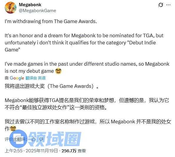 “《Megabonk》获得TGA提名是莫大的荣誉,也是梦想成真,但很遗憾,我认为它不符合‘最佳独立处女作’的评选标准。我曾以不同工作室名义开发过游戏,因此《Megabonk》并非我的处女作,”他写道,“我衷心感谢提名、支持与投票,但占据这个奖项名额并不妥当。”