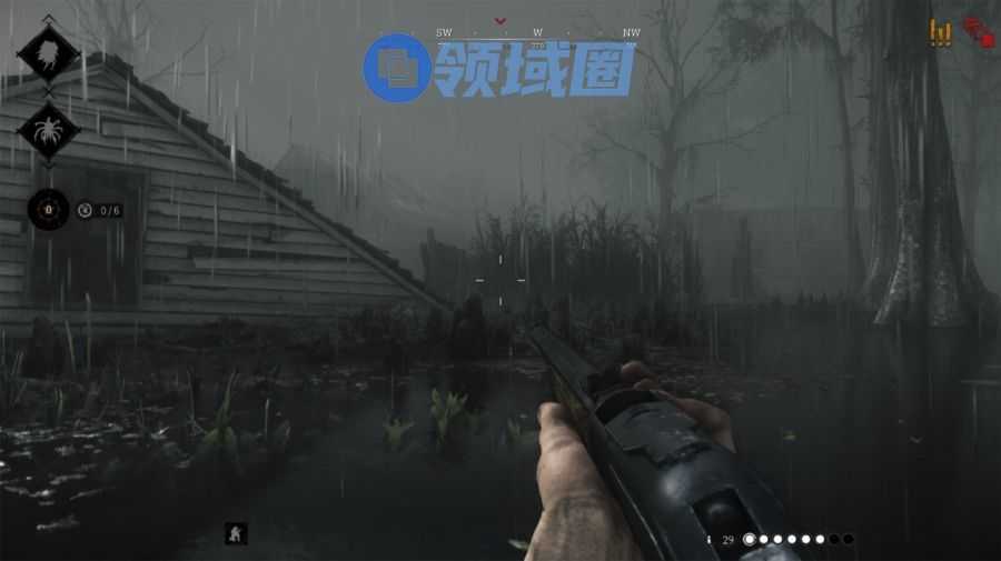 想到此行目的,我不由幻视到初次踏足《猎杀:对决》的情境,刚下过雨的河口路面泥泞,整个世界笼罩在一种肃杀的灰调中。沿着马路前行,能碰上不少荒废的篱笆与房舍,透露出世界的颓败底色,四处游荡的丧尸完成最后的艺术加工,把游戏带到一个绝妙的混合地带——19世纪美国南部的粗犷与野性,变异、邪魔带来的恐怖、黑暗,没有一个老猎人能抵抗这种陈旧的、神秘的诱惑。