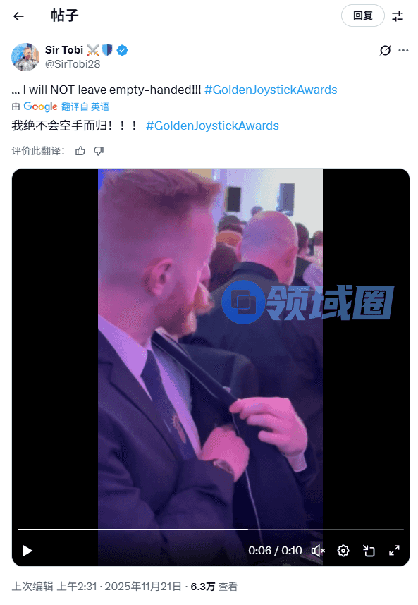 此外,《天国:拯救2》制作组战马工作室的公关总监Sir Tobi发文表示:“我绝不会空手而归!”随后顺走了金摇杆颁奖现场的餐具。网友见状纷纷调侃波西米亚盗圣发力了。