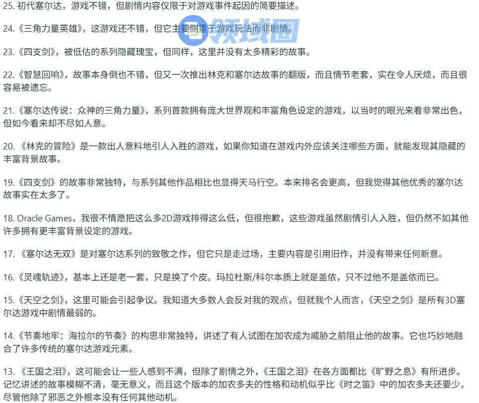 而在这场讨论中,任天堂于Switch时代发布的两部3D开放世界作品《塞尔达传说:旷野之息》与《塞尔达传说:王国之泪》并未获得太多青睐。虽然玩家们都对这两作的玩法夸赞不已,但叙事方面大多都认为多少有点糟糕。不过,由光荣特库摩近期发布的《王国之泪》前传故事《塞尔达无双:封印战纪》却得到了玩家们不少赞誉,发帖的玩家也评价道"这部史诗级、倾注心血、惊艳绝伦的奇幻前传,让我对《王国之泪》里那些默默无闻的角色产生共鸣,更引入了整个系列中最讨喜的原创角色。"并将其排在了第七的位置,比这两部正统续作都要高。