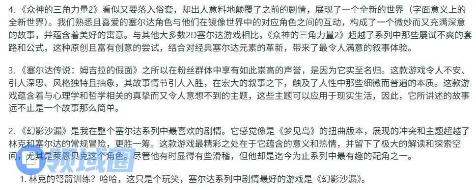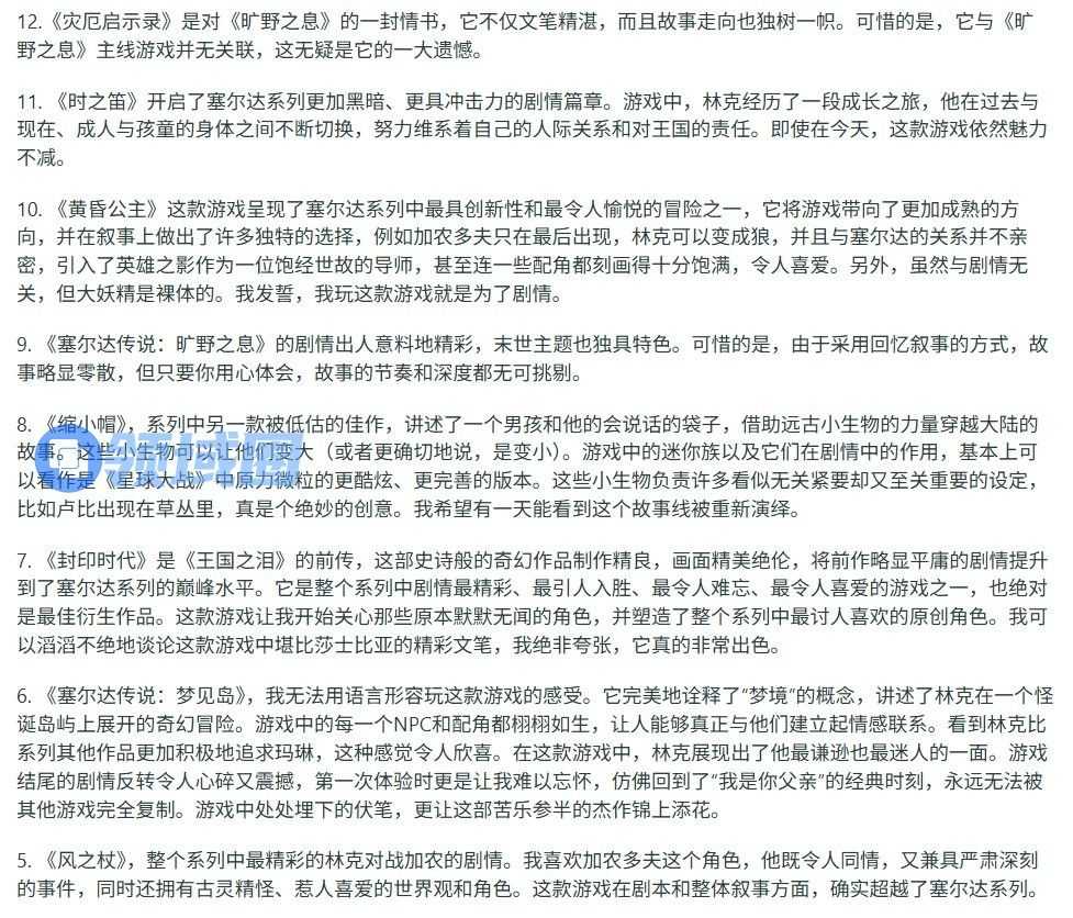 那一作《塞尔达传说》的故事最好?或者换句话说哪一部《塞尔达传说》的叙事表现最好?优秀的剧情未必能转化为顶级的叙事水准。真正让人沉浸的故事,往往需要充满情感张力的高潮段落和清晰可辨的主题内核。因此,这个问题也在粉丝玩家群体中争论了多年。而近期有玩家在红迪上以倒叙的形式列举了自己心目中《塞尔达》系列的叙事佳作。
