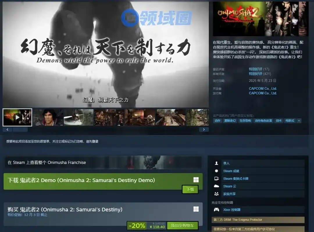卡普空今日宣布,《鬼武者2复刻版》试玩版现已正式登陆PlayStation 4、Xbox One、Switch及Steam平台。官方特别说明,试玩版的存档数据将无法继承至正式版游戏。现试玩版宣传视频已同步推出,一起来看看吧!