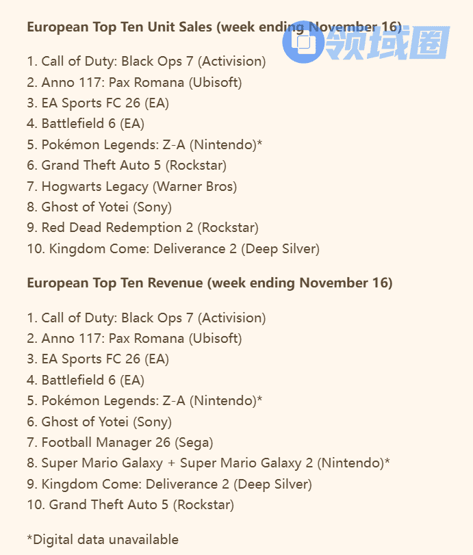 尽管《使命召唤:黑色行动7》成功登顶上周欧洲地区游戏销量榜,但其市场表现较前作及竞争对手出现显著下滑。根据GSD统计数据显示,该作实体版与数字版的首周总销量较《战地6》同期低63%。
