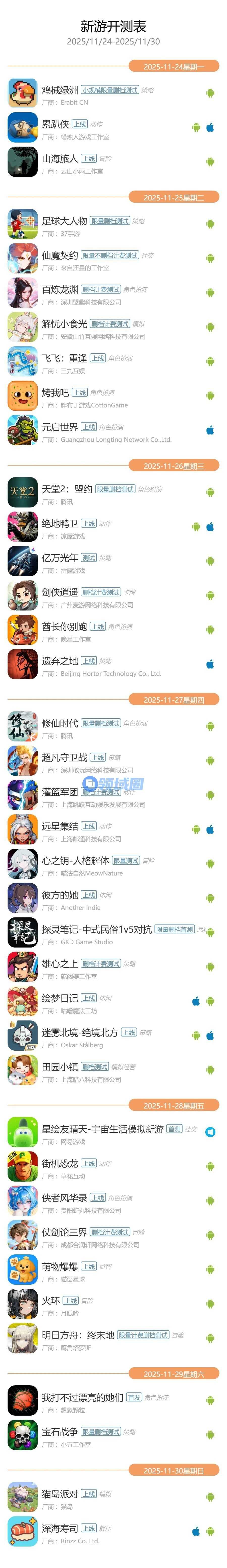 2025年11月24日—2025年11月30日的最新手游开测信息,共有38款游戏开测。以下是开测信息: