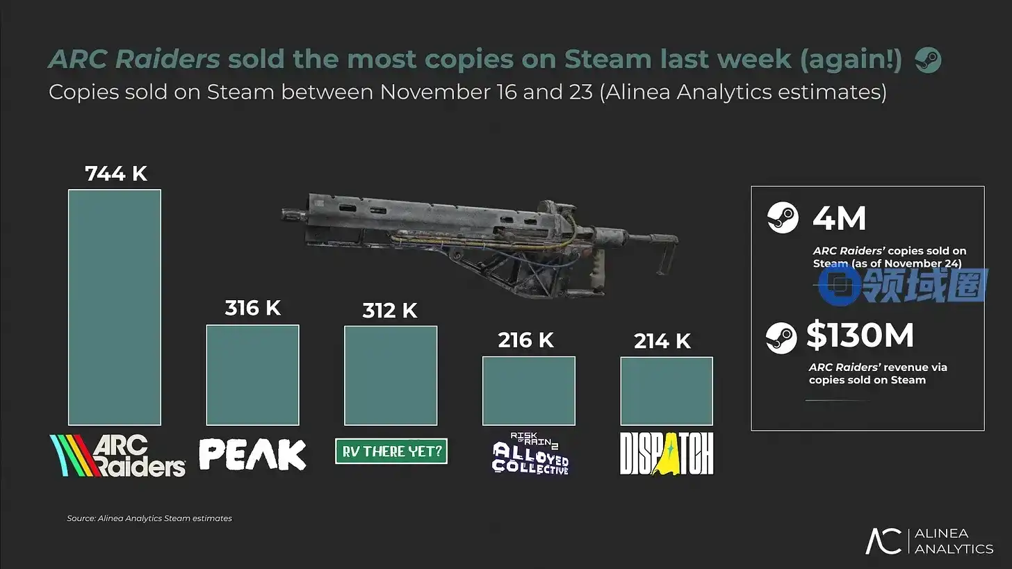 《ARC Raiders》连续第四周蝉联Steam周销量冠军,上周销量近75万份(收入2500万美元),这使得《ARC Raiders》在Steam上的总销量达到400万份,并迅速逼近全平台700万份的销量大关。