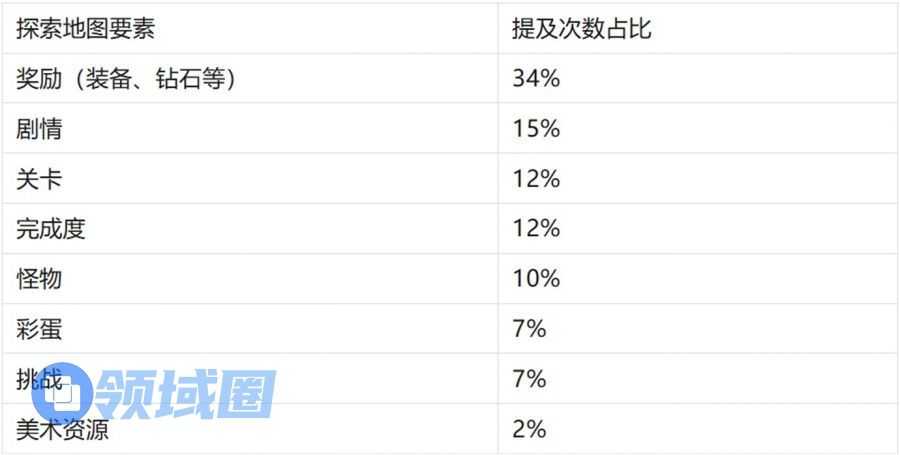 结果:主要驱动力为奖励(34%),其次是剧情(15%)、关卡(12%)、完成度(12%)、怪物(10%)、彩蛋(7%)、挑战(7%)、美术资源(2%)。