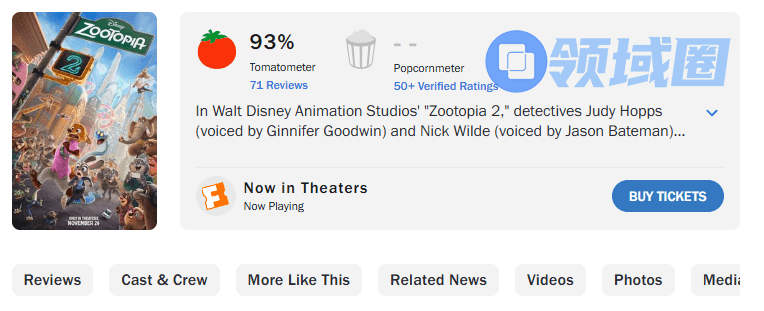 迪士尼动画续作《疯狂动物城2》在上映前获得广泛好评。根据烂番茄的数据,截至发稿时影片基于71篇影评收获93%新鲜度,多家媒体将其评价为迪士尼近年来表现最出色的续作之一。