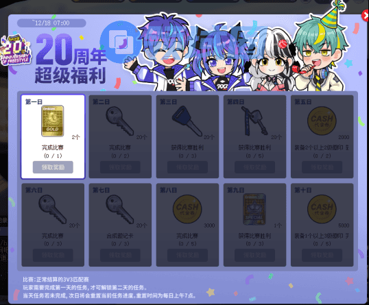 即日起至12月18日,玩家完成每天任务正常结算的3V3匹配赛即可领取20周年超级福利,玩家需要完成第一天的任务,才可解锁第二天的任务,累计可以获得10000代金券以及其他奖励。