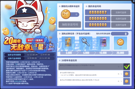 玩家可以通过消耗20周年幸运币抽取全区唯一专属号码,号码可以参与12月8日周年庆福利直播夜抽奖,奖励包括“全超特变更卡全家福”、“超特角色包”等百万豪礼。12月9日起玩家还可以参与个人抽奖,领取最高200万代金券奖励。