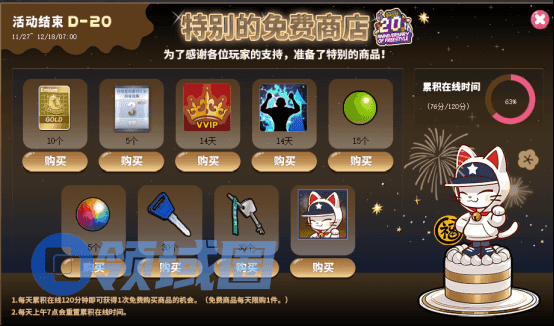 为了感谢各位玩家的支持,我们准备了特别的商品,玩家每天累计在线120分钟即可获得1次免费购买商品的机会,免费商品每天限购一件!