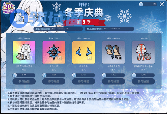玩家每天通过比赛以及登录可以获得积分,消耗积分可以参与奖品抽签,每件奖品只能参与一次抽签,可以参与多个奖品的抽签,奖励包括超大号冬季一整套等稀有奖励。
