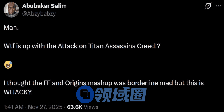 他在社交平台上写道:“《刺客信条》和《进击的巨人》这是搞什么?我原以为《刺客信条:起源》跟《最终幻想》的联动已经够疯狂了,但这次简直是胡闹。”