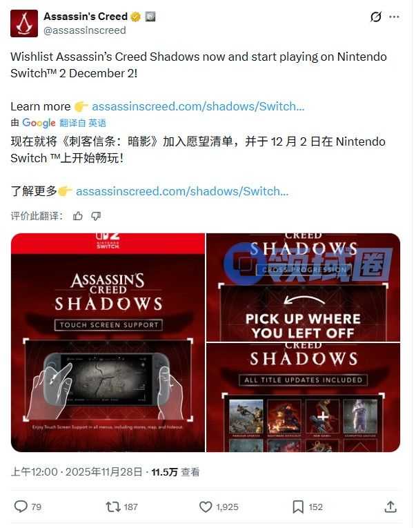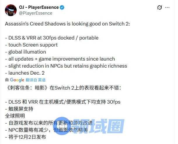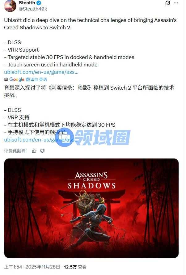 11月28日,育碧在其官网上发布了《刺客信条:影》Switch 2版幕后开发消息,详细介绍了移植背后的技术创新。《刺客信条:影》Switch 2版即将于12月2日发售。