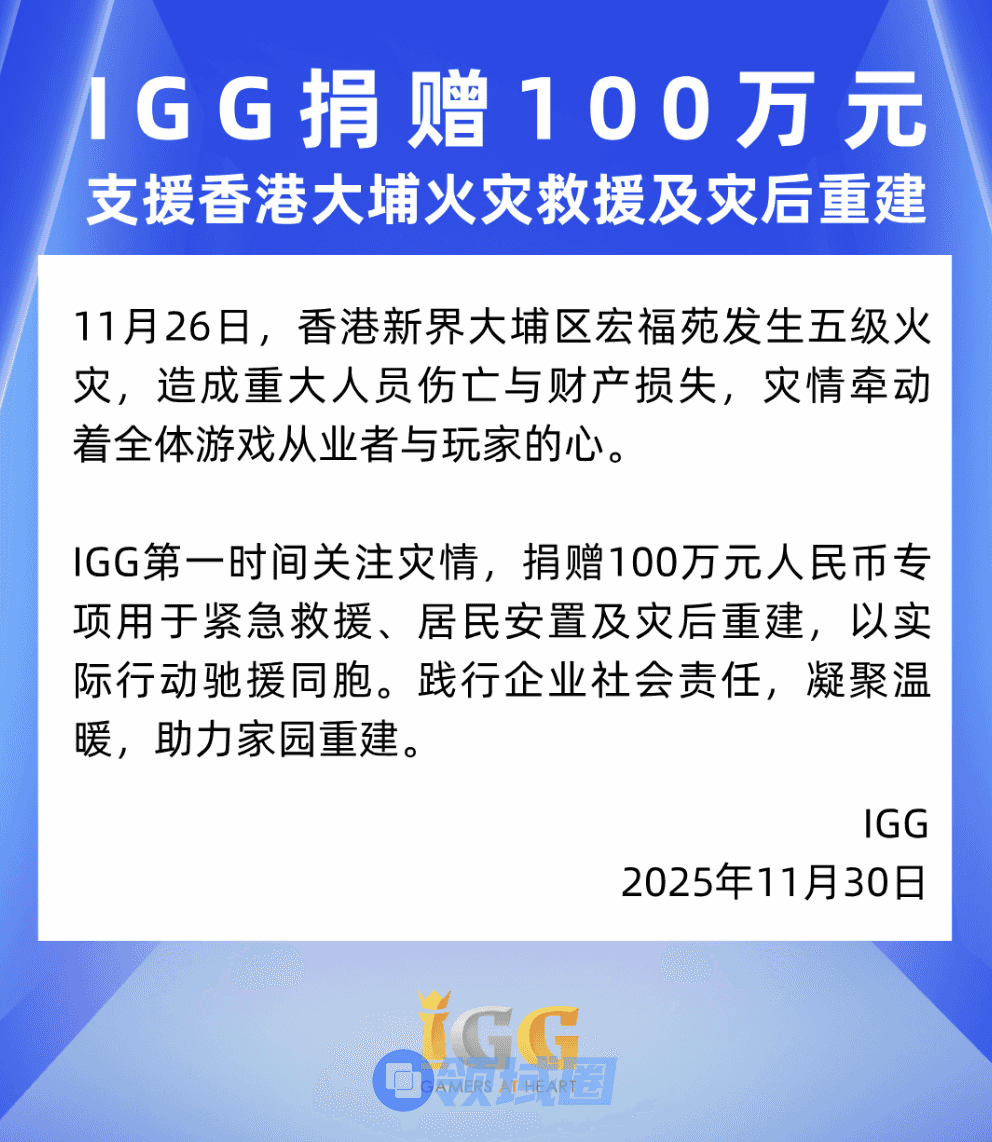 11月26日,香港新界大埔区宏福苑发生五级火灾,造成重大人员伤亡与财产损失,灾情牵动着全体游戏从业者与玩家的心。