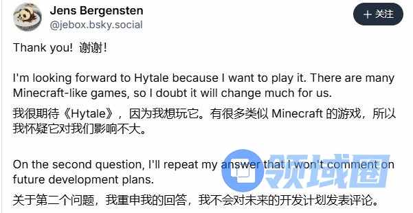 近日,《我的世界》首席设计师、Mojang Studios首席创意官Jens“Jeb”Bergensten在回复网友提问时,表达了对《Hytale》的个人期待。当被问及如何看待这款被部分社区视为《我的世界》“竞争者”的作品时,他表示:“我很期待《Hytale》,因为我想玩它。”