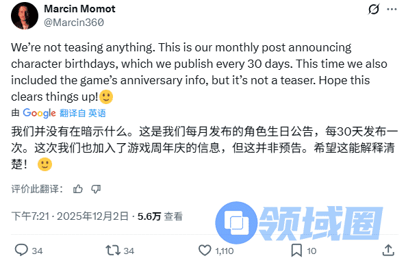 然而,CDPR全球社区总监Marcin Momot在随后澄清称,该帖子并非任何形式的预告,仅是工作室每月例行发布的角色生日纪念内容。他表示,这类祝贺贴过去几个月均有发布,本次仅额外加入了游戏周年的信息,属于常规流程。