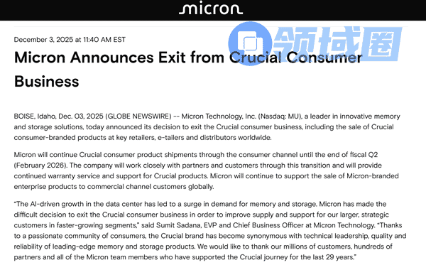 公司补充说明,该决定反映了美光对其持续产品组合转型的承诺,以及其业务与内存存储领域长期、盈利增长方向的重新对齐。“通过专注于核心的企业与商用领域,美光旨在提升长期业务表现,并为战略客户及股东创造价值。”