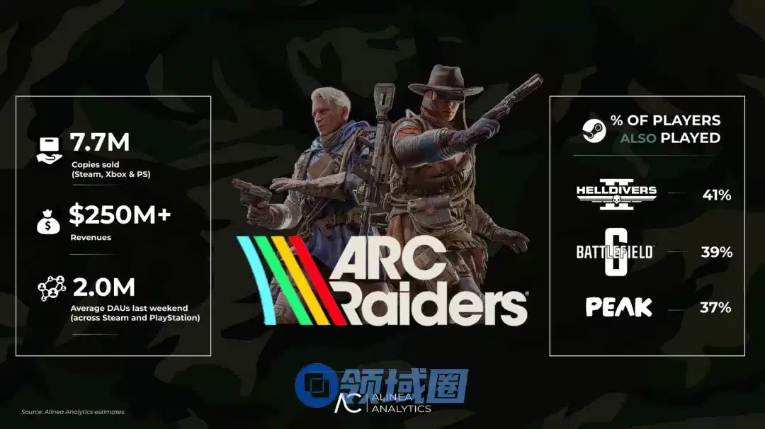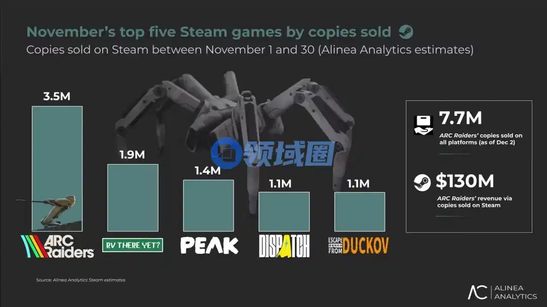 根据Alinea Analytics发布的最新报告,《ARC Raiders》是2025年11月Steam上最畅销游戏,销量达到了350万套,目前全平台累计销量已达770万套。这意味着PC Steam版的销量占比将近一半。