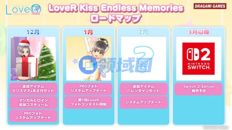 Dragami Games近日公布了恋爱冒险游戏《LoveR Kiss:Endless Memories》的上市后更新路线图,计划在未来几个月内为游戏陆续带来多轮内容更新,包括全新的季节性主题道具、服装以及摄影系统升级,并确认了Nintendo Switch 2版本的发售窗口。