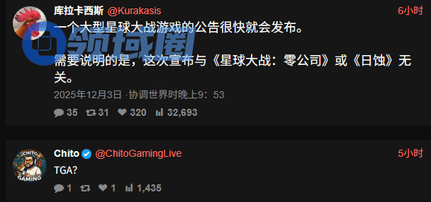 他表示,即将到来的这一公布与《星球大战:零号连队》 或《星球大战:日蚀》无关,而是另一款尚未公开的作品。部分玩家推测,这可能是由 Respawn Entertainment 开发的《星球大战绝地》系列第三部作品(“三部曲终章”),而正式公布有可能会在即将举行的TGA上进行。