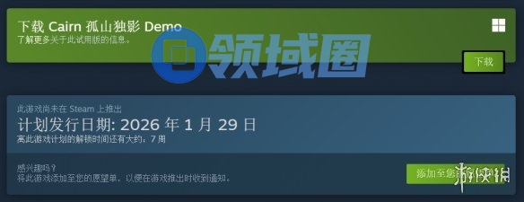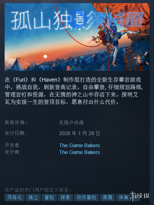 《孤山独影》是一款由The Game Bakers工作室开发的生存攀岩游戏,这款游戏原本计划于今年年底发售,但看起来游戏似乎延期了。因为官方现已公布游戏的正式发售日期:本作将于2026年1月29日发售,登陆PC(Steam)/PS5平台。