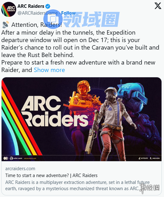 《ARC Raiders》官方近日宣布,游戏首次"远征行动"开启时间将延后两日,为玩家提供更多备战窗口。据游戏官方X账号公告,远征窗口现调整为2025年12月17日开启,较原定的12月15日晚两天。