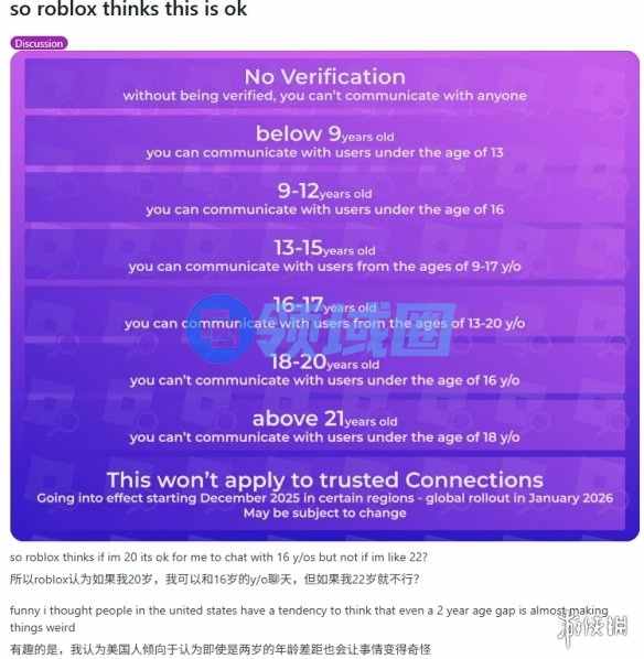 年龄验证通过后,用户将被划分为六组并受到严格聊天限制:例如9岁以下仅能与13岁以下用户交谈,13-15岁用户对话范围限定在9-17岁,21岁以上成人则禁止与18岁以下任何用户沟通。这导致许多长期保持社交关系的玩家因年龄组别变更而陷入"聊天室静默"状态。