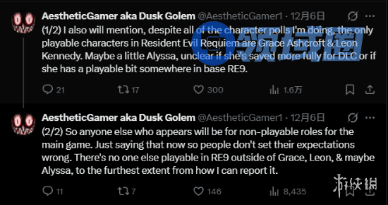 知名恐怖游戏爆料人Dusk Golem于日前再度透露了关于《生化危机:安魂曲》(即《生化危机9》)的细节。据其所述,游戏中真正可全程操作的角色将聚焦于两位:全新的FBI分析师女主角格蕾丝·阿什克罗夫特,以及系列人气角色里昂·肯尼迪。
