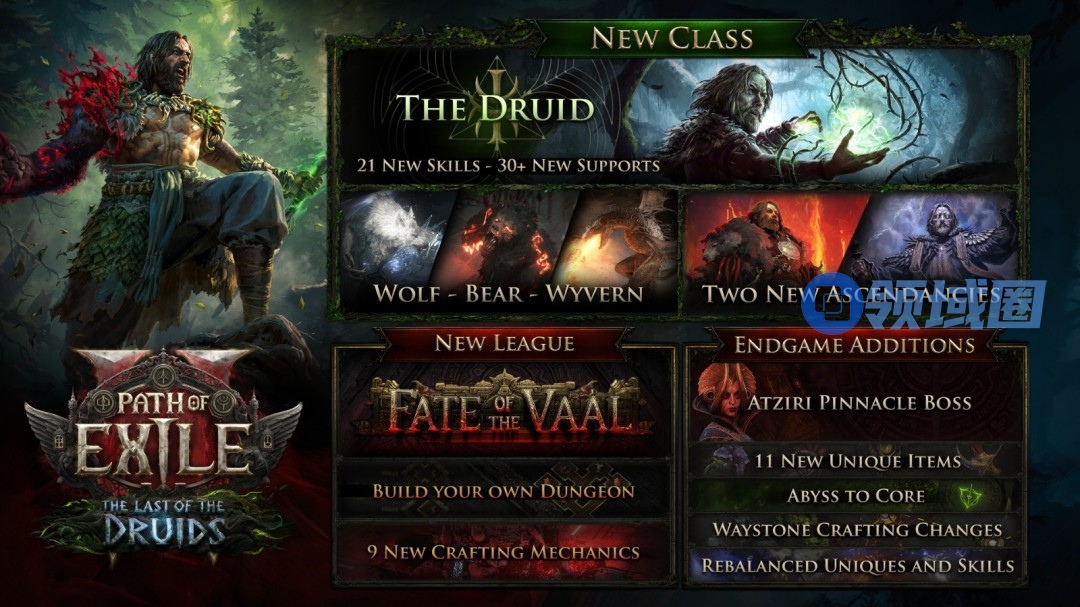 近日《流放之路》官方公布了《流放之路2》新赛季“末裔德鲁伊”更新前瞻,本次改动巨大,追加了新职业、新技能、新天赋和新传奇物品等。由于本次平衡性调整和天赋树的变化,玩家还将获得一次免费天赋树重置。国际服更新时间为12月12日,国服更新时间为12月19日。